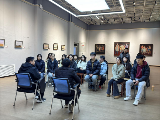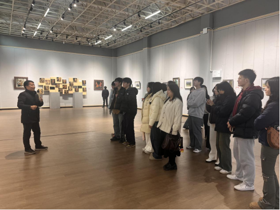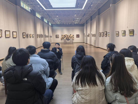 展厅集中展示了赵老师近五年来的绘画创作及教学成果,展品包括漆画、油画人物及五十余幅油画风景写生作品。接着,赵老师给大家详细介绍了其中几幅代表作品的创作经历和心得体会。他分享了如何从日常生活中汲取灵感,将点滴情感融入每一笔触之中,以及在创作过程中遇到的挑战和突破。赵老师特别强调了艺术与生活之间的紧密联系,鼓励同学们用心感受周围的世界,将个人的情感体验通过画笔传达出来,创造出具有生命力的作品。