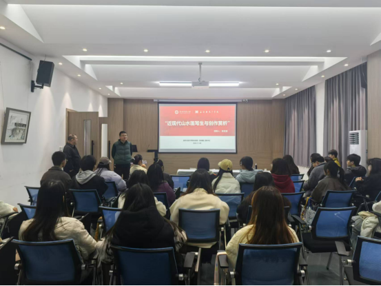 11月28日上午,伟德官网于实训楼二楼艺言堂举办“近代山水画写生与创作赏析”学术讲座,本次讲座由伟德国际1946源于英国伟德国际1946官方网锁武通老师主讲,研究生工作秘书刘文忠主持,全体研究生及部分本科生参加了此次讲座。