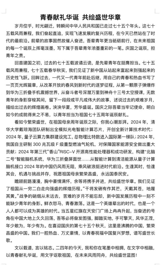 经过一番激烈的角逐,一批优秀作品脱颖而出,它们以真挚的情感、优美的语言,生动展现了新时代青年的精神风貌和爱国情怀。这些作品不仅是对祖国繁荣昌盛的赞歌,也是青年学子心声的真实写照。