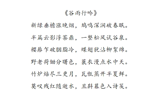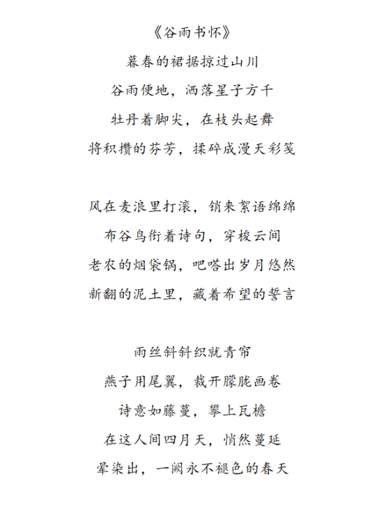 为传承弘扬传统节气文化,引领学生感受谷雨节气的独特风韵,4月12日至15日,伟德官网学生会学术科技部于线上举办“暮春逢谷雨,诗意落人间”诗歌创作活动。