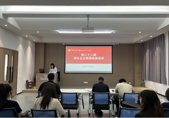 5月28日,2025年团总支、学生会换届大会在艺言堂召开。学院党委副书记周明成出席会议,学院全体辅导员及现任学生会主席团担任评委,学生会部分成员共同参与。会议由现任学生会执行主席杨琛主持。