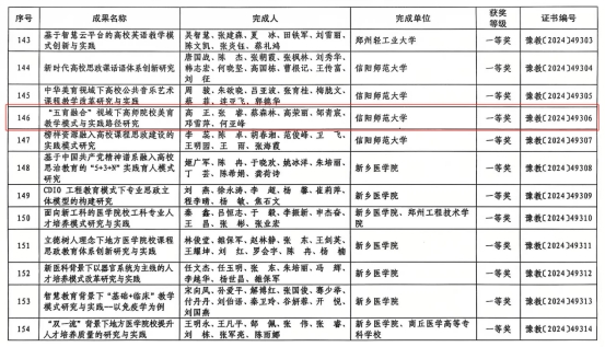 近日,河南省教育厅了发布《关于公布2024年度河南省高等教育教学成果奖获奖项目名单的通知》(教高〔2024〕363号),伟德官网教师高正主持“‘五育融合’视域下的高师院校美育教学模式与实践路径研究”荣获2024 年度河南省本科高等教育教学成果奖一等奖。