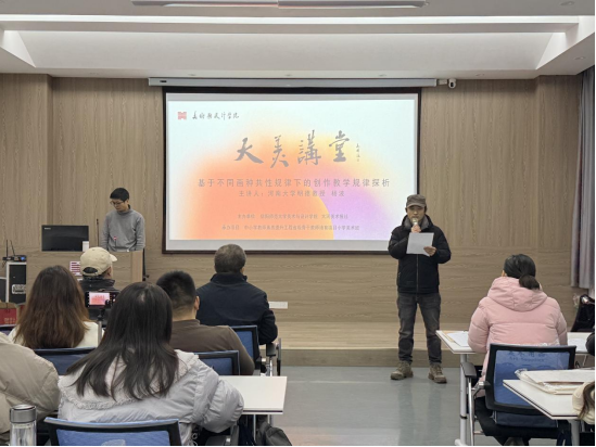 上午,杨波教授以《基于不同画种共性规律下的创作教学规律初探》为题,通过分析学生作品,深入探讨美术史、学情与创作思维培养。他提出抛开画种偏见,以更好地认识和学习绘画,讲座结束后还与大家就“作品的构图训练”“颜料色彩多样性趋势下的教学”等问题展开交流。
